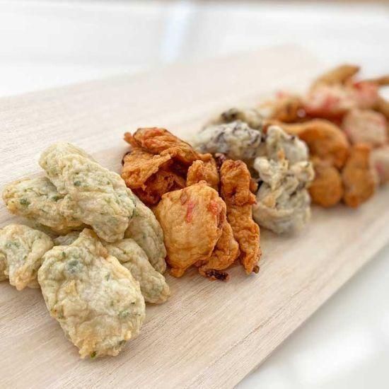 紅生姜・イカゲソ・キャベツを練りこんだお好み焼き風味のつまみ揚げ。鰹節や青海苔、ソースなどでお召し上がりいただけます。