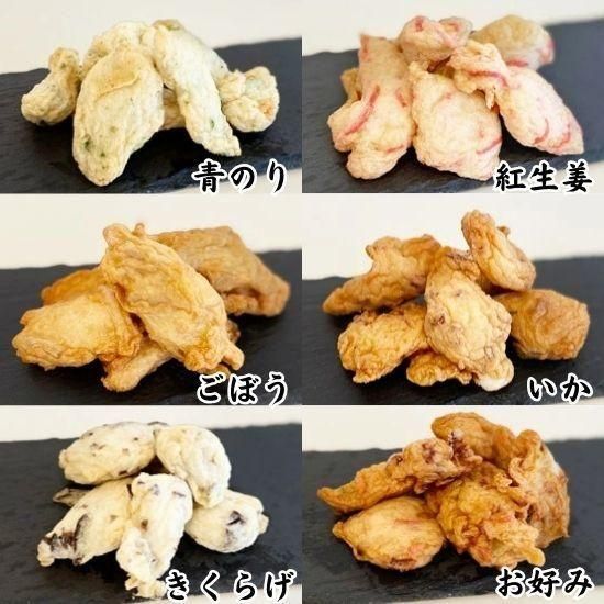 原材料名 | 魚肉(ぐち、いとより、たら、その他)、種もの(きくらげ、紅生姜、青海苔、ごぼう、いか、キャベツ)、みりん、砂糖、食塩、米油、加工でん粉、調味料(アミノ酸等)、着色料(赤3号)、(原材料の一部に小麦を含む) |